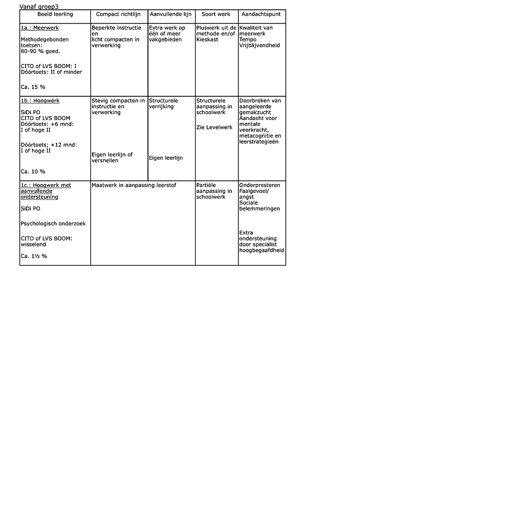 3. De strakke rigide opzet van lesmethodes. In groep 1-2 zie je al dat er meer systematisch en methodisch gewerkt wordt, waardoor voor spelend en ontdekkend leren steeds minder ruimte is. In groep 3 is dat nog een graadje erger. We stellen daarbij vast dat sommige kinderen een achterstand hebben en bijgespijkerd moeten worden en dat andere kinderen een voorsprong hebben en er feitelijk geen goed aanbod is. Aan het begin van het schooljaar zul je van je collega van groep 2 informatie hebben gekregen over de leerlingen. Harde informatie in de vorm van CITO scores en zachtere informatie over sociaal emotionele ontwikkeling, welbevinden en taakbesef. We zien bij de overgang naar groep 3 vaak verschillen optreden in het beeld van de leerkracht van groep 2 en de leerkracht van groep 3. Kinderen die in de groepen 1 en 2 als begaafd of hoogbegaafd omschreven worden, blijken in groep 3 juist helemaal niet zo begaafd te zijn. Navraag levert vaak de volgende antwoorden op: